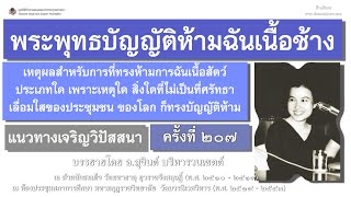 เนื้อก็เพิ่มโทษขึ้นตามลำดับขั้น ถ้าไม่พิจารณาก็เป็นอาบัติทุกกฏ พระพุทธบัญญัติห้ามฉันเนื้อช้าง ก็เป็นเรื่องเนื้อสัตว์ประเภทต่างๆ ที่ทรงบัญญัติห้าม เพื่อท่านผู้ฟังที่เป็นอุบาสก อุบาสิกา จะได้ไม่ถวายสิ่งที่ไม่ควร ไม่ถูกต้องตามพระพุทธบัญญัติ ไม่ใช่ว่าเมื่อท่านมีศรัทธา ก็จะถวายเนื้อไปเสียทุกประเภท