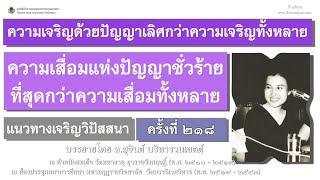 ถ้าท่านมีสมบัติ และสมบัตินั้นหมดไป รู้สึกเดือดร้อนมาก เป็นผู้ที่ไร้สมบัติเสียแล้ว แต่ตราบใดที่ท่านเป็นผู้ที่เจริญด้วยปัญญา ย่อมดีกว่าการที่ท่านจะยังคงมีทรัพย์สมบัติมาก แต่ว่าเป็นผู้ที่ไร้ปัญญา หรือว่าเป็นผู้ที่เสื่อมจากปัญญา ก็เป็นเรื่องที่ท่านผู้ฟังจะพิจารณาว่า การเสื่อมอย่างไหนเป็นการเสื่อมที่ชั่วร้ายที่สุด
