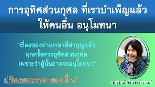 เพราะฉะนั้นในเรื่องของทาน มี ๓ ประการคือ ทานมัย แปลว่า บุญสำเร็จด้วยการให้ ๑ แล้วก็ การอุทิศส่วนกุศลที่เราบำเพ็ญแล้วให้คนอื่นอนุโมทนา ๑ แล้วก็การอนุโมทนาในกุศลของคนอื่น ๑ มี ๓ อย่าง ถึงแม้ว่าเราไม่ได้ทำเอง เราเพียงอนุโมทนา ขณะนั้นจิตเราก็เป็นกุศล เพราะว่าถ้าเราไม่ชอบคนนั้น ต่อให้เขาทำดียังไงเราก็ไม่เห็นจะอนุโมทนาเลย เป็นคนตระหนี่แม้แต่การจะชื่นชมในกุศลของคนอื่น เห็นสภาพของจิตว่าน่าเกลียด ที่เป็นอกุศลธรรมได้ต่างๆ นานา แม้แต่สิ่งที่ดีที่คนอื่นทำก็หาข้อติหรือว่าไม่อนุโมทนา ขณะนั้นเป็นอกุศลของเราเอง เพราะฉะนั้นในเรื่องของท่านเวลาที่ทำบุญแล้ว ทุกครั้งควรอุทิศส่วนกุศล เพราะว่าผู้นั้นอาจจะอนุโมทนา พอกุศลจิตเขาเกิด ถ้าเขาเป็นเปรต แล้วก็สามารถที่จะพ้นสภาพความเป็นเปรตได้ เมื่อหมดกรรมนั้น เขาสามารถที่จะอนุโมทนา แล้วก็พ้นจากกรรมนั้นได้