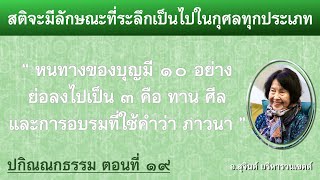 ท่านอาจารย์ แต่สติจะมีลักษณะที่ระลึกเป็นไปในกุศลทุกประเภท เช่น ในทาน คิดที่จะสละวัตถุให้แก่คนอื่น นั่นคือ สติที่ระลึกไม่ใช่เรา ขณะที่เห็นมด แต่ไม่ฆ่า ถ้ามดตกน้ำ เราก็ค่อยๆ ช้อนขึ้นมา ใช้กระดาษทิชชู่จุ่มลงไปให้เขาไต่ขึ้นมา นั่นคือ สติที่ระลึกเป็นไปที่จะช่วยชีวิต ที่เป็นประโยชน์ การกระทำที่เป็นประโยชน์กับบุคคลอื่น ขณะนั้นเป็นสติไม่ใช่เรา ที่ระลึกได้ที่จะทำประโยชน์ ขณะที่จิตใจเร่าร้อน โกรธคนนั้น โกรธคนนี้ แล้วคิดว่า ความโกรธไม่มีประโยชน์เลย เพราะว่าคนที่เราโกรธ เขากำลังสบาย กำลังสนุกสนาน และเรามานั่งเดือดร้อน กลุ้มใจสารพัดอย่าง เป็นทุกข์ เพราะฉะนั้น ขณะที่ระลึกได้ที่จะเห็นโทษของโทสะ ขณะนั้นเป็นสติที่กำลังทำหน้าที่ระลึกได้ ขณะที่กำลังฟังธรรมขณะนี้ เป็นสติที่ระลึกว่า ชีวิตของเราน้อย ทุกอย่าง เกิดมาแล้วเอาไปไม่ได้เลย นอกจากทำให้ติดในสิ่งนั้นเพิ่มขึ้น เพราะฉะนั้น แทนที่จะไปเพลิดเพลิน ไปดูโทรทัศน์ ไปอ่านหนังสืออะไรต่างๆ มาฟังเรื่องความจริงว่า ในโลกนี้ ในชีวิตนี้ จะสามารถรู้อะไรที่เป็นของจริงของแท้ซึ่งไม่เคยรู้มาก่อน และเป็นความจริงที่พิสูจน์ได้ ที่พระพุทธเจ้าท่านทรงแสดงเพราะว่า ทรงตรัสรู้ความจริงว่า เป็นอย่างนี้ ขณะนี้เป็นสติที่ทำให้มานั่งฟังธรรม ไม่มีตัวตนเลย บางครั้งเป็นกุศล บางครั้งเป็นอกุศล ก็เป็นจิตประเภทต่างๆ ขณะที่สติเกิดจะต้องเป็นไปในบุญญกิริยาวัตถุ ๑๐ คือ หนทางของบุญมี ๑๐ อย่าง ย่อลงไปเป็น ๓ คือ ทาน ศีล และการอบรมที่ใช้คำว่า ภาวนา ที่ใช้คำว่า ภาวนา นี้ไม่ใช่ไปนั่งท่อง ภาวนา คือ การทำให้เกิดสิ่งซึ่งยังไม่เกิด และสิ่งที่เกิดแล้วทำให้มีเพิ่มขึ้น หมายความว่า ทั้งสติปัญญา ทั้งความรู้ต่างๆ ซึ่งไม่เคยมี เพราะฉะนั้น อบรม คือ ภาวนา ให้ค่อยๆ มีขึ้น ให้ค่อยๆ เพิ่มขึ้น เจริญขึ้น นี้คือความหมายของภาวนา เพราะฉะนั้น การฟังธรรมในขณะนี้ คือ เบื้องต้นของภาวนา ถ้าไม่มีการฟังให้เข้าใจแล้ว การอบรมจิตใจมีไม่ได้ ก็จะไปหลงนั่งทำอะไรไม่ทราบ ซึ่งไม่ใช่เป็นการรู้ลักษณะของสภาพธรรม ปัญญาก็ไม่เกิด เพราะฉะนั้น จิตเป็นสภาพรู้ ไม่ต้องใช้คำว่า ตาม และสติต้องเป็นกุศลธรรมหรือโสภณะ หมายความถึง ธรรมที่ดีงามฝ่ายเดียว สติเป็นอกุศลไม่ได้ ต้องเป็นกุศล หรือว่า เป็นสภาพธรรมที่ดีงาม ถ้ามีใครกำลังเดินข้ามถนน รถไม่ทับ หลบหลีกงูตามถนน หรืออะไรก็แล้วแต่ ขณะนั้นไม่ใช่สติเลย เป็นสมาธิ เป็นความตั้งใจ แน่วแน่ที่จะหลบเลี่ยง เพราะว่า สมาธินี้เป็นมิจฉาสมาธิก็ได้ เป็นสัมมาสมาธิก็ได้ คือ เป็นได้ทั้งฝ่