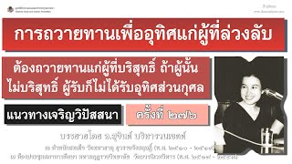 ข้อความต่อไป ท่านจะทราบว่า การถวายทานเพื่ออุทิศแก่ผู้ที่ล่วงลับไปแล้วที่เกิดเป็นเปรตนั้น จะต้องถวายทานแก่ผู้ที่บริสุทธิ์ ถ้าผู้นั้นไม่บริสุทธิ์ ผู้รับก็ไม่ได้รับอุทิศส่วนกุศล เพราะเหตุว่าไม่เป็นปัจจัยที่จะให้โสมนัสและอนุโมทนาได้