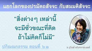 เพราะฉะนั้นก็เห็นความต่างกัน ของปรมัตถสัจจะกับสมมติสัจจะ และการอบรมเจริญปัญญาจะต้องรู้ว่า ถ้าเป็นการคิดไม่มีสภาพปรมัตถธรรมปรากฏในเรื่อง แต่ตัวจิตที่คิดไม่ใช่เราคิด เพราะฉะนั้น เวลาที่คิดก็จะไม่หวั่นไหว แล้วก็จะไม่เดือดร้อน ถ้าสามารถจะรู้ว่า คิดไม่ดีก็เป็นสภาพธรรมไม่ใช่เรา คิดดีก็เป็นสภาพธรรมไม่ใช่เรา และปัญญาก็จะเห็นตามความเป็นจริงรู้จักตัวเองตรง ไม่หลอก ไม่สร้าง ไม่ไปพยายามบังคับ หรือทำสิ่งที่ไม่ใช่ชีวิตจริงๆ เพราะเหตุว่า ปัญญาจริงๆ ต้องรู้ว่า ทำสภาพธรรมหนึ่งสภาพธรรมใดให้เกิดไม่ได้เลย แต่สามารถอบรมเจริญปัญญา รู้ความจริงของสภาพธรรมซึ่งมีปัจจัยเกิดตั้งแต่เกิดจนตาย ไม่สามารถที่จะมีเราไปแทรก เป็นเราที่จะไปบังคับ ไปฝืนกระแสจิต หรือวาระของวิถีจิตได้เลย เช่น ขณะที่เกิดขณะแรก เลือกเกิดไม่ได้ แต่จิตที่เกิด ต้องเป็นประเภทผลของกรรมที่ภาษาธรรมใช้คำว่า วิปากจิต