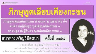 แล้วแต่ลักษณะของบุคคลว่า จะยกผู้อื่นสูง หรือว่าจะยกตนไว้สูง และตั้งผู้อื่นไว้ต่ำ บางสำนักก็ติดตามลูกศิษย์ เวลาที่ลูกศิษย์หายไปสู่สำนักอื่น ท่านติดตาม ไม่ใช่เพื่อจะถามถึงทุกข์สุข แต่ติดตามเพื่อจะให้กลับมาสู่สำนักของท่าน หรือว่าบำรุงสำนักของท่าน นี่เป็นการพูดเลียบเคียงกับชน โดยการที่ยกตนไว้สูง ตั้งผู้อื่นไว้ต่ำ หรือว่าบางท่านอาจจะยกผู้อื่นสูง และตั้งตนไว้ต่ำก็ได้