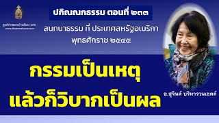 เพราะฉะนั้น ต้องเข้าใจคำ ๒ คำ คือ กรรมเป็นเหตุ แล้วก็วิบากเป็นผล ซึ่งใครก็หนีไม่พ้น ไม่มีใครหนีพ้นผลของกรรมได้ทุกวัน ลืมตาตื่นขึ้นมาก็เป็นวิบากคือเป็นผลของกรรม ได้ยินเสียงขณะไหน แม้ขณะนี้ก็เป็นผลของกรรม เพราะฉะนั้น ก็จะมีความเข้าใจในเรื่องของกรรม และผลของกรรมซึ่งภาษาบาลีใช้คำว่า “วิบาก”