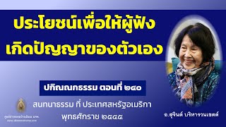 ท่านอาจารย์ การที่พระอรหันตสัมมาสัมพุทธเจ้าทรงแสดงพระธรรม ประโยชน์เพื่อให้ผู้ฟังเกิดปัญญาของตัวเอง เพราะว่าถ้าไม่มีปัญญาของตัวเอง อย่างไรๆ ก็ไม่รู้แจ้งอริยสัจธรรม ที่เราเคยใช้หรือว่าเคยได้ยินบ่อยๆ อริยสัจธรรม ต้องเป็นปัญญา จึงจะสามารถรู้แจ้งได้