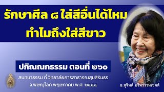 ท่านอาจารย์ สอนสำหรับคนไม่รู้ ถูกต้องไหม คนไม่รู้สอนคนไม่รู้ให้ไม่รู้ต่อไป หรือว่าสอนให้คนเข้าใจถูกจนกระทั่งเป็นความเห็นถูกเพิ่มขึ้น ต้องเป็นผู้ตรง รู้อะไรบ้าง จากการนุ่งขาวใส่ขาว ใส่สีอื่นไม่รู้หรือ ขณะนี้ตั้งหลายสี ใส่อะไรก็ได้ แต่สามารถที่จะฟังพระธรรม กษัตริย์ลิจฉวีไปเฝ้าพระผู้มีพระภาคหลายสี เครื่องฉลองพระองค์ ไม่ได้จำกัดว่าเราจะบริสุทธิ์เพราะสี หรือว่าปัญญาของเราจะเกิดเพราะสี ใส่สีขาวแต่ใจขณะนั้นกำลังโกรธ กำลังโลภ แล้วสีขาวมีประโยชน์อะไร มีสำนักหนึ่งเป็นสำนักที่บวชชีพราหมณ์ก็เชิญดิฉันไปพูดธรรม ดิฉันจะรับไปทุกแห่งที่เชิญ เพราะว่าผู้เชิญต้องการฟัง แต่สิ่งที่ดิฉันจะพูดต้องพูดตามความเป็นจริง ตรงตามพระธรรม เพราะฉะนั้น ก่อนที่จะพูดเรื่องของศีล ๘ ของผู้ที่นุ่งขาวห่มขาวที่เป็นชีพราหมณ์ ดิฉันถามบุคคลนั้นว่าทำไมถึงใส่สีขาว คือต้องมีเหตุผล เพื่ออะไรจึงถาม เพื่อให้คิดให้พิจารณาให้เกิดปัญญาของตัวเอง ไม่ใช่ว่าไปที่ไหน ใครให้ทำอะไรก็ทำ แต่ไม่มีปัญญาเลย แล้วไปทำไม ไปเพื่อไม่มีปัญญา หรือว่าไปเพื่อมีปัญญา เพราะฉะนั้น เมื่อจะใส่สีขาวก็ต้องถามเหตุผลว่า ทำไมถึงใส่สีขาว ท่านผู้นั้นก็ตอบว่า รักษาศีล ๘ ดิฉันก็ถามว่า รักษาศีล ๘ ใส่สีอื่นได้ไหม เป็นปกติได้ไหม และเรื่องของการรักษาศีล ส่วนใหญ่คนจะลืมจุดประสงค์ ทำไมถือศีลมากขึ้น บางคนก็คิดว่าศีลมากก็เป็นที่เคารพจากสถานภาพของการใส่เสื้อผ้า ก็เห็นว่าเป็นผู้ที่มีศีลตั้ง ๘ คงจะเป็นที่นับถือ แต่สำหรับผู้นั้นเองที่จะรักษาศีลมากหรือน้อย ต้องเป็นผู้ตรง เพื่อความขัดเกลากิเลสของตนเอง อย่างพระภิกษุท่านสละอาคารบ้านเรือน วงศาคณาญาติ ลองคิดถึงที่บ้าน ท่านมีทรัพย์สมบัติอะไรบ้าง อาหารก็เป็นจานหลากหลาย บางท่านก็เป็นเศรษฐีมั่งมีเงิน ๘๐ โกฏิ กี่โกฏิก็แล้วแต่ จานเงินจานทองท่านก็สละไปเพื่อบาตรที่เป็นที่ใส่อาหาร ท่านสละความติดข้อง สละลาภ สละยศ สละเกียรติ สรรเสริญต่างๆ วงศาคณาญาติ ความสนุกสนานจากการคบหาสมาคมกับมิตรสหายทั้งหลาย ในสมัยนั้นก็มีการเที่ยวเตร่ไปดูมหรสพ อย่างท่านพระสารีบุตรกับพระมหาโมคคัลลานะ ท่านก็เป็นตระกูลเศรษฐี แต่ว่าขณะที่กำลังดู ท่านก็เกิดจิตที่สะสมมารู้ว่า คนที่กำลังหัวเราะให้เราดู โศกเศร้าให้เราดู ไม่ช้าเขาก็ตาย แม้ตัวเองก็ต้องตายจากโลกนี้ไป เพราะฉะนั้น จะได้อะไรจากความเพลิดเพลินเพียงเล็กน้อยในขณะนั้น ฉันใด ท่านเหล่านั้นเป็นผู้มีปัญญาจึงสามารถสละ สละจริงๆ สละแล้วจะกลับมารับอีกได้ไหม จริงใจหรือเปล่า ถูกต้อ